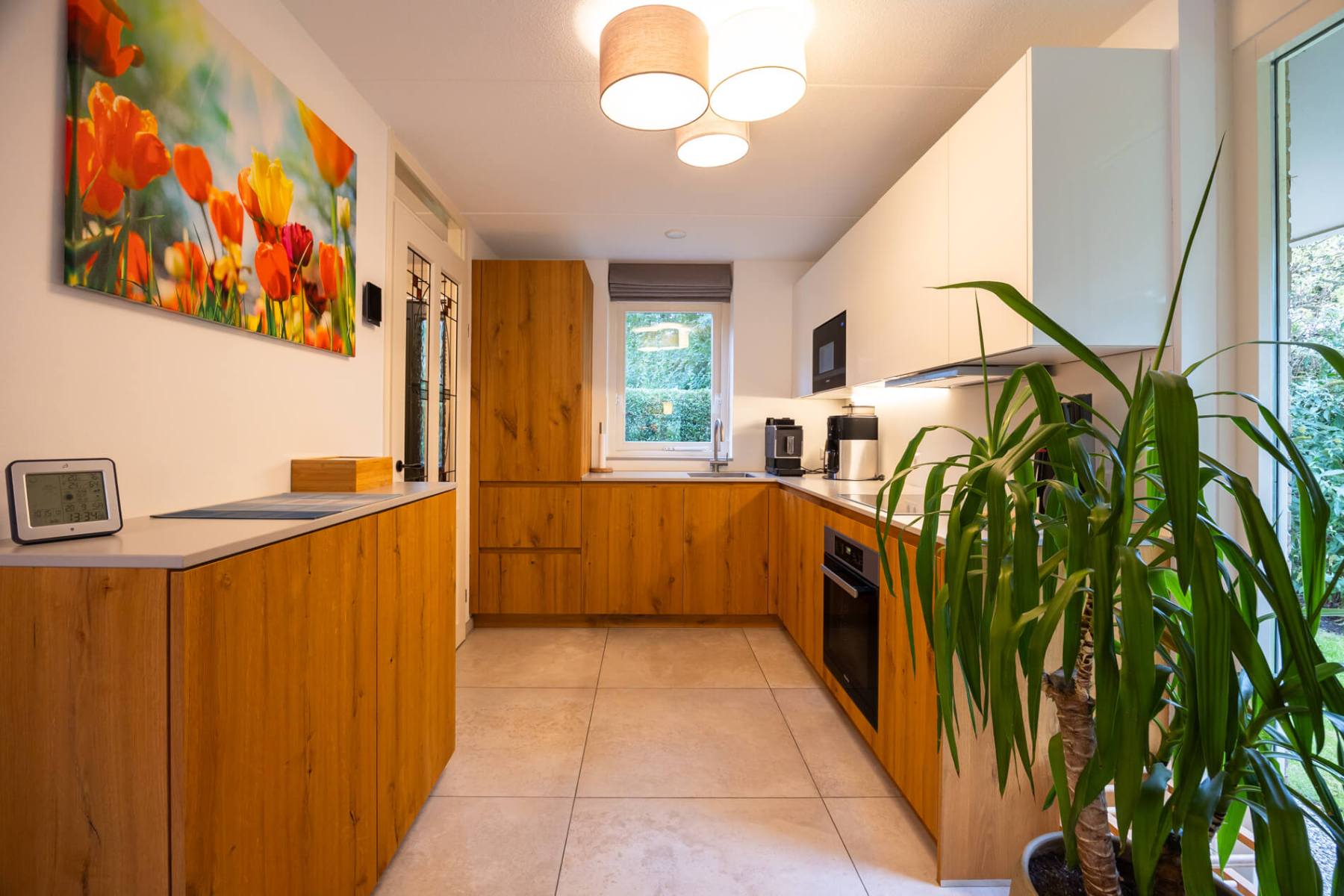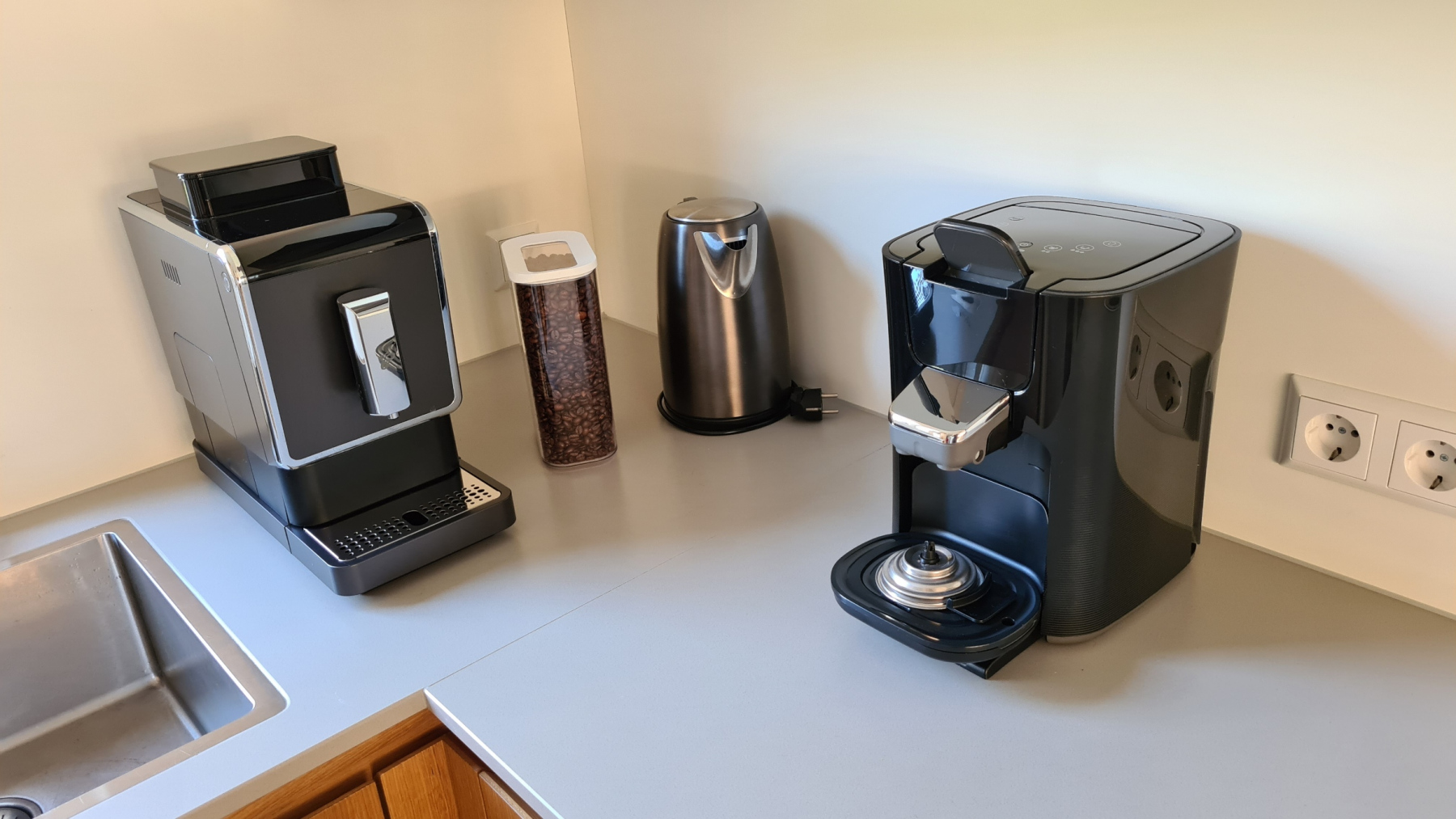 Die an den Wohn-/ Essbereich angrenzende offene Küche ist u.a. mit Geschirrspüler, Backofen, Induktionsherd, Kühl-Gefrierschrank, verschiedenen Kaffeemaschinen (Senseo, Filterkaffeemaschine, separatem Milchaufschäumer), Toaster und Sandwich-Toaster ausgestattet.