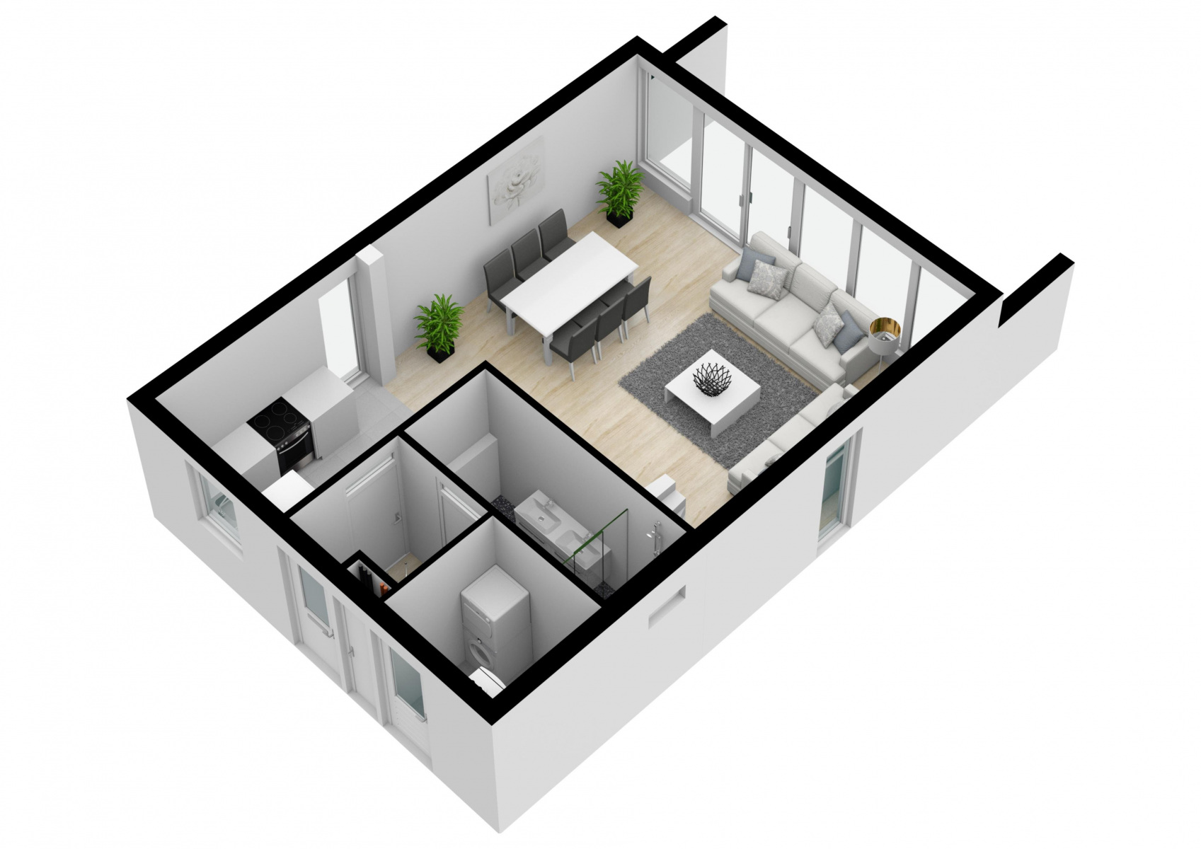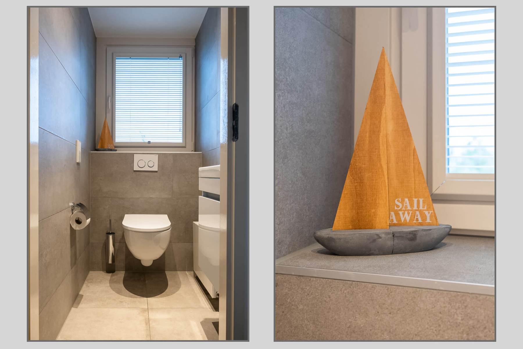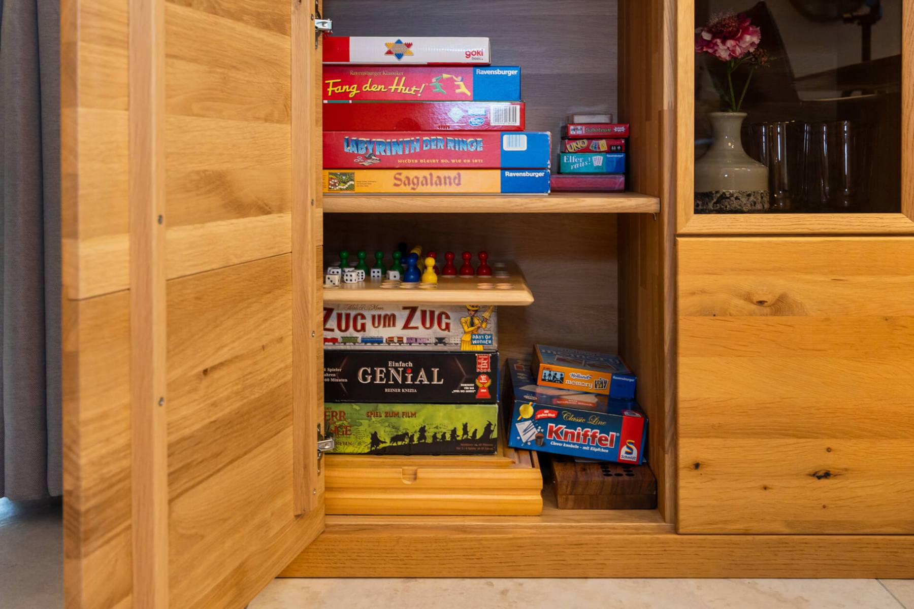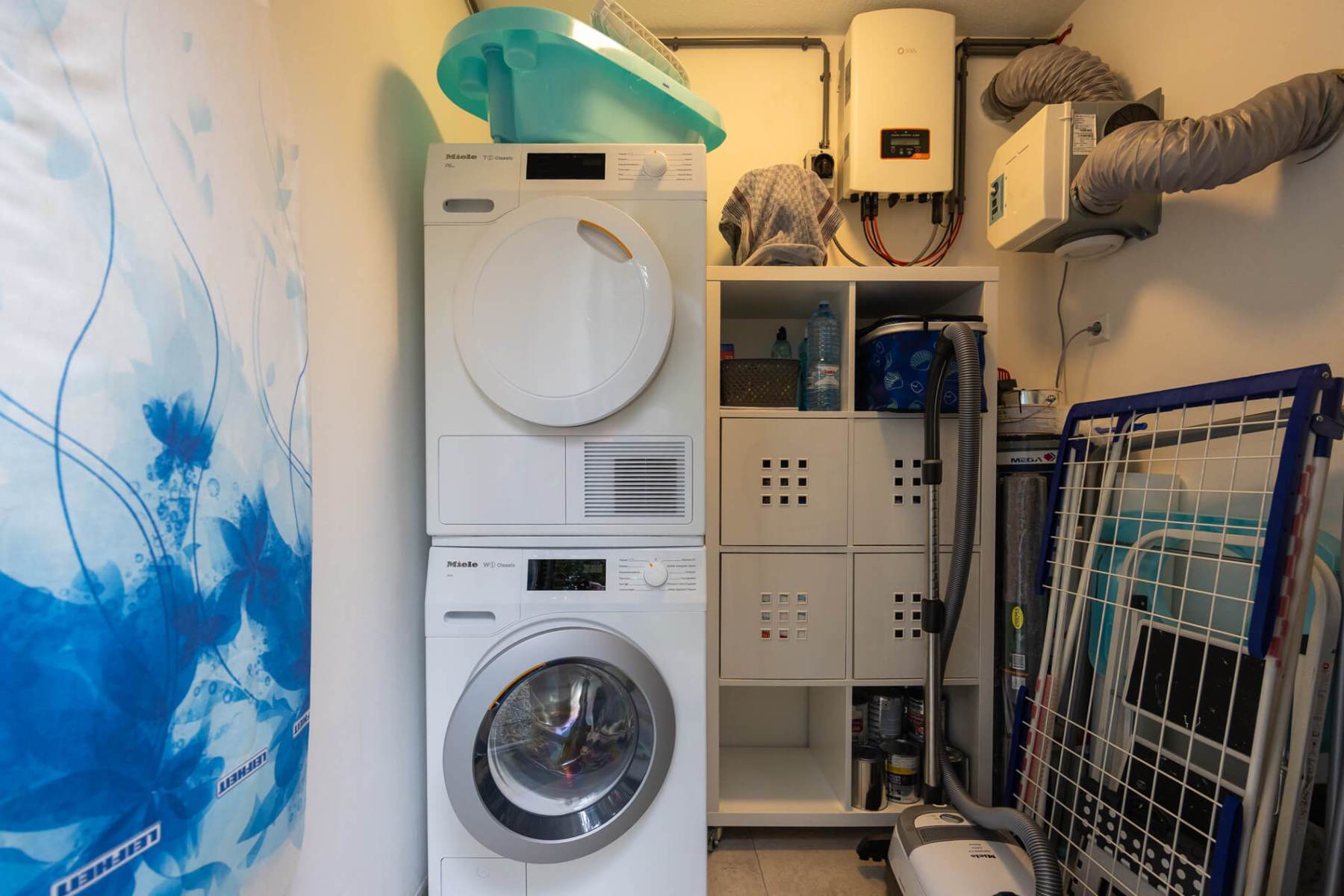 In einem an den Wohnbereich angrenzenden separaten Hauswirtschaftsraum befinden sich u.a. Waschmaschine, Trockner und Bügelbrett.