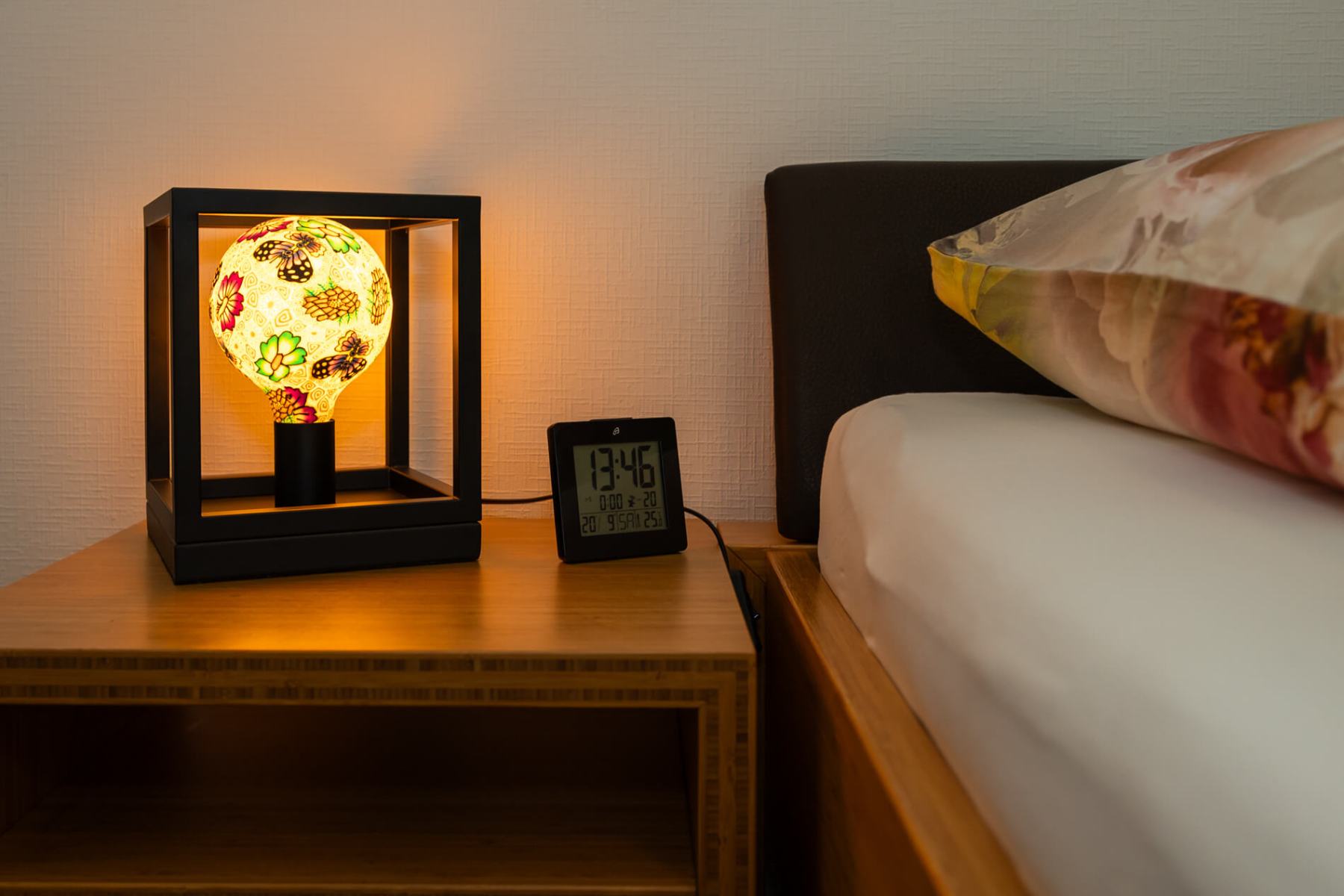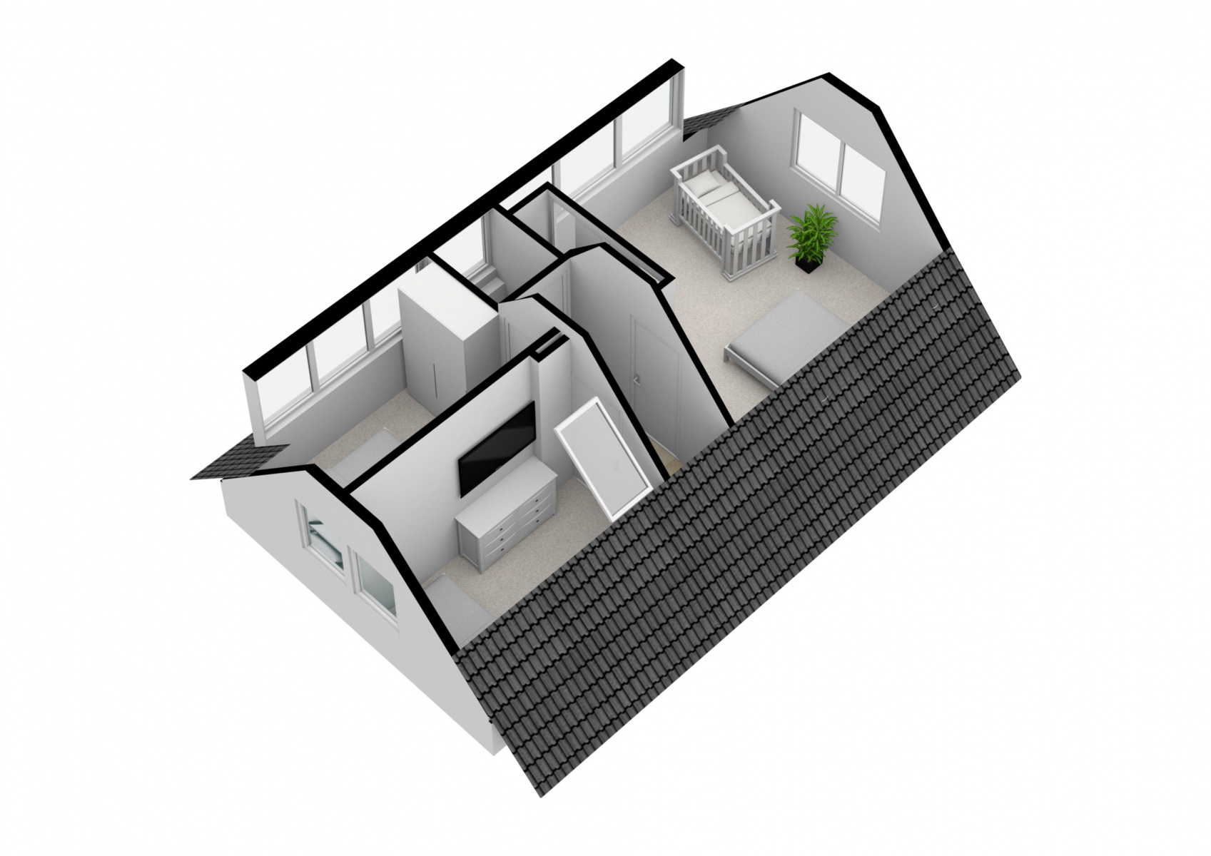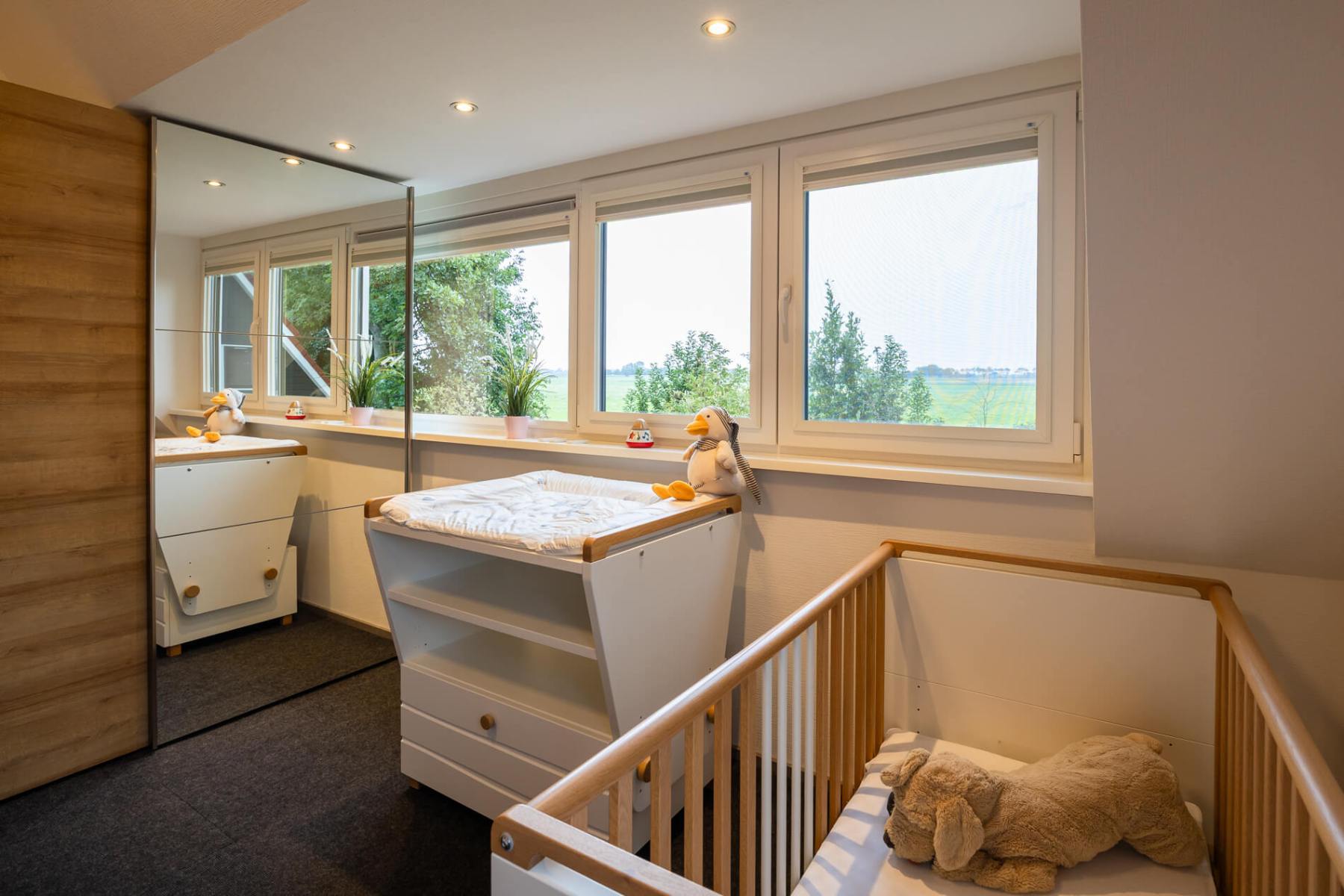 Im Obergeschoss befinden sich drei Schlafzimmer sowie ein Gäste-WC. Das größere Schlafzimmer auf der rechten Seite des Flurs verfügt über ein 160 cm breites Doppelbett, einen Schrank, ein Kinderbett mit Matratze, das bei Bedarf aufgestellt werden kann, sowie zusätzlichen Stauraum hinter dem Kleiderschrank.