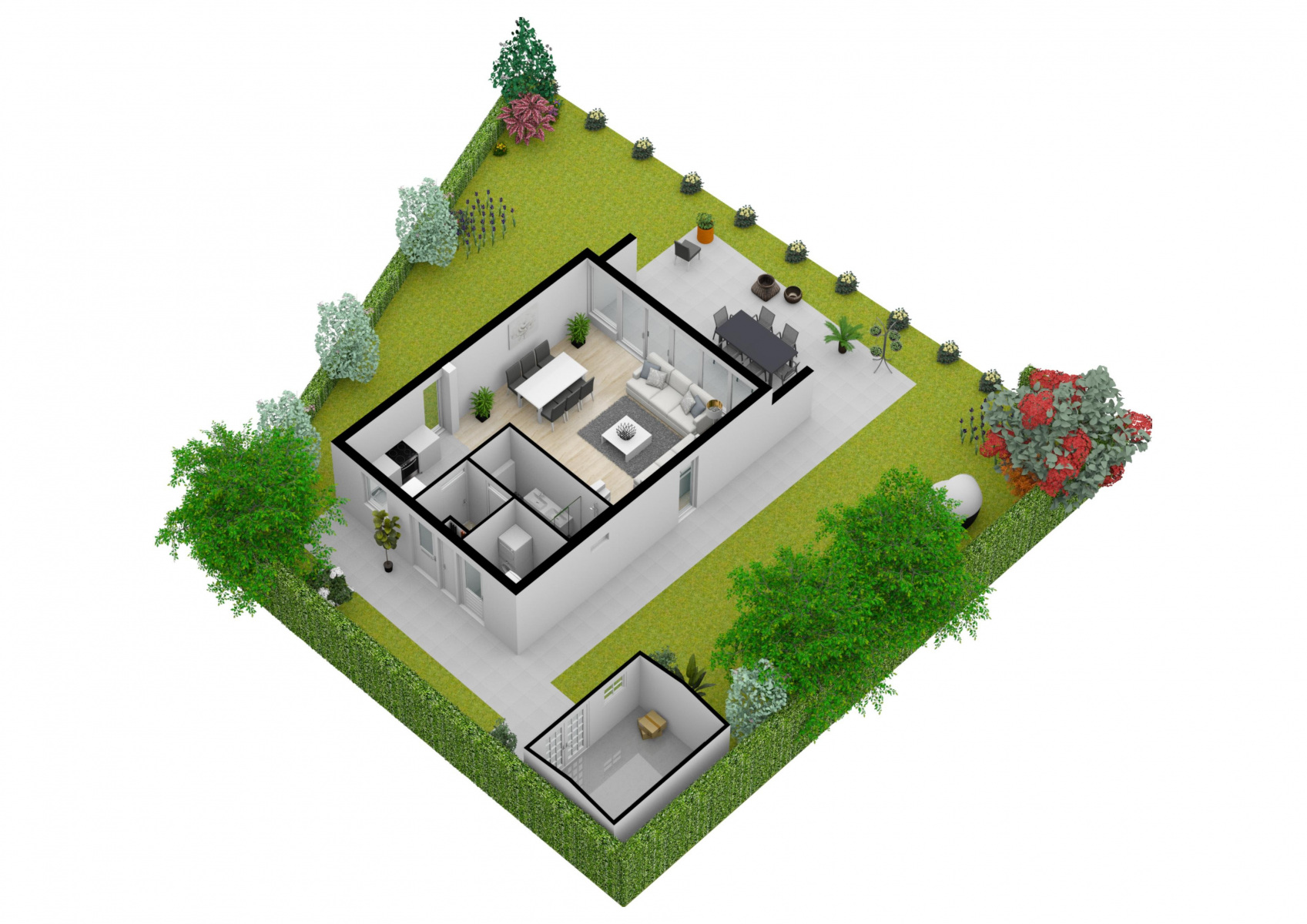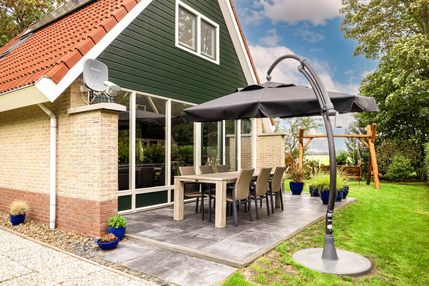 Auf dieser Terrasse befinden sich unter der Überdachung gemütliche Gartenmöbel für sechs Personen. Eine zusätzliche Sitzecke im Garten mit Tisch und weiteren Liegestühlen laden ebenfalls zum Entspannen ein. Für gemütliche Grillabende steht ein Gasgrill zur Verfügung.