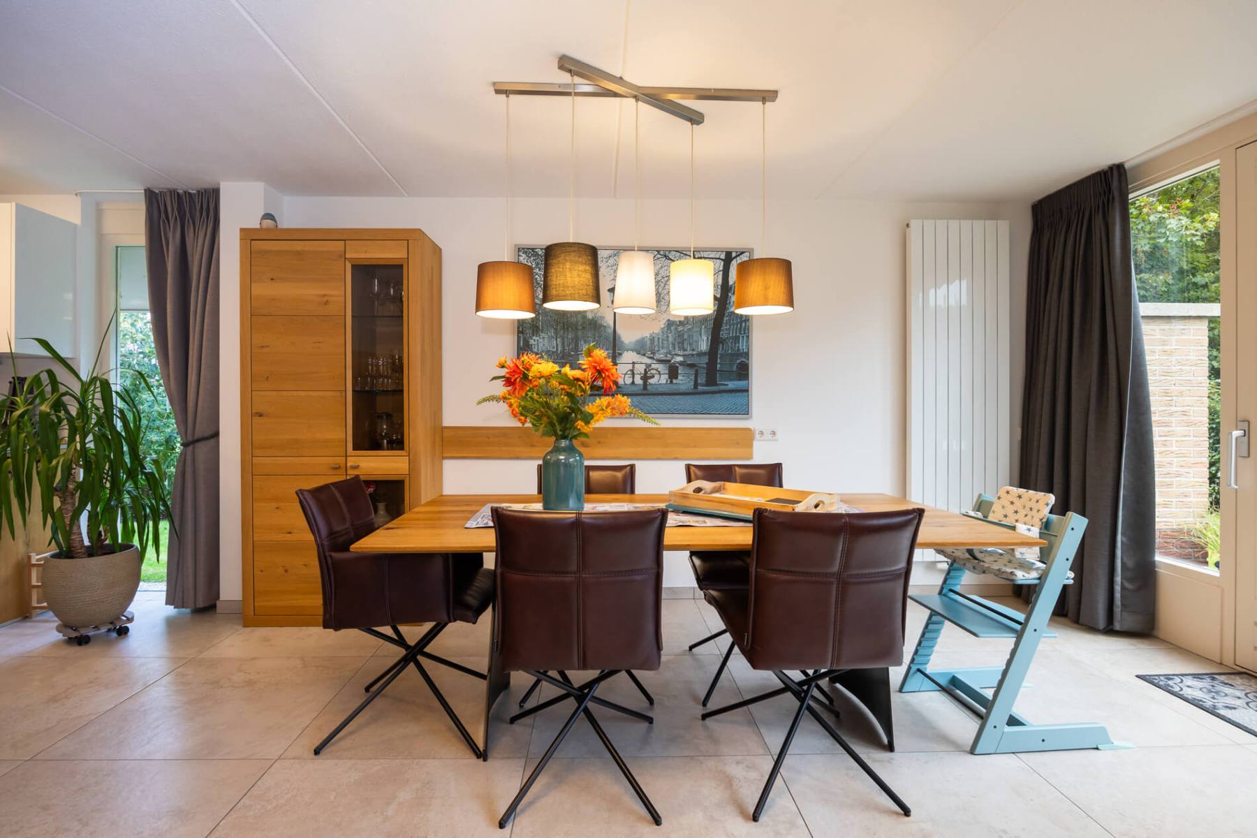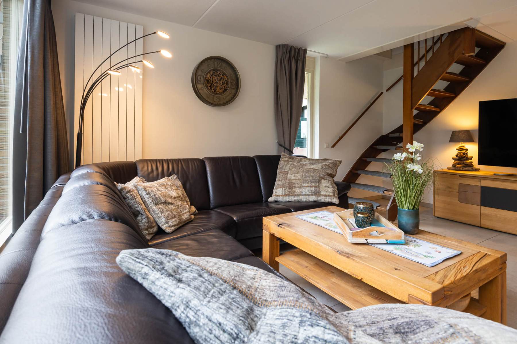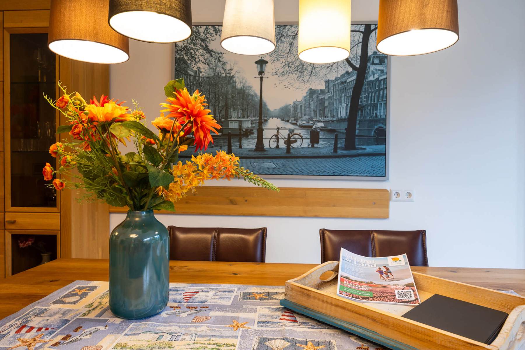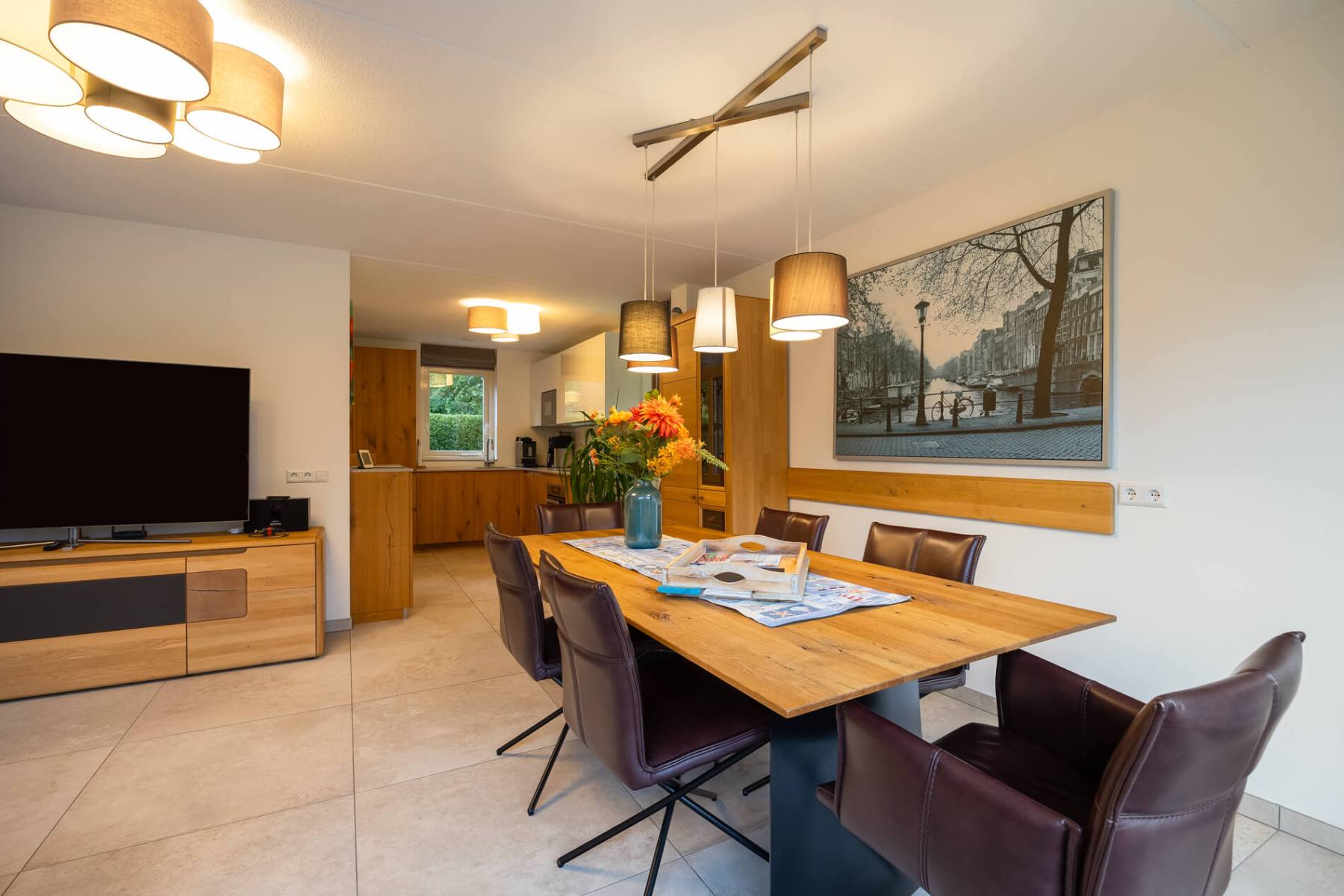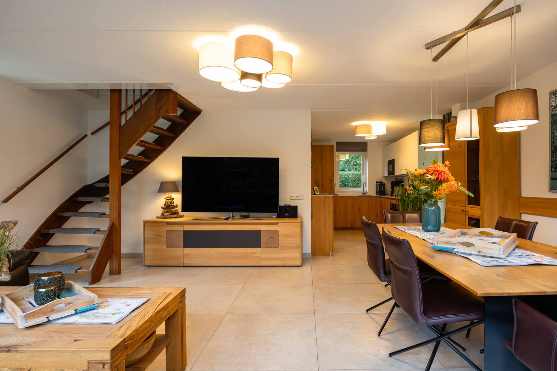 Das Haus verfügt im EG über eine Diele, einen sehr gemütlichen Wohn-/Essbereich mit offenem Kamin, Fußbodenheizung (Fliesenboden), zusätzlichen Wandheizkörpern, Gigabit-Internet mit WLAN, ein TV-Gerät mit deutschen und niederländischen Programmen sowie Netflix.