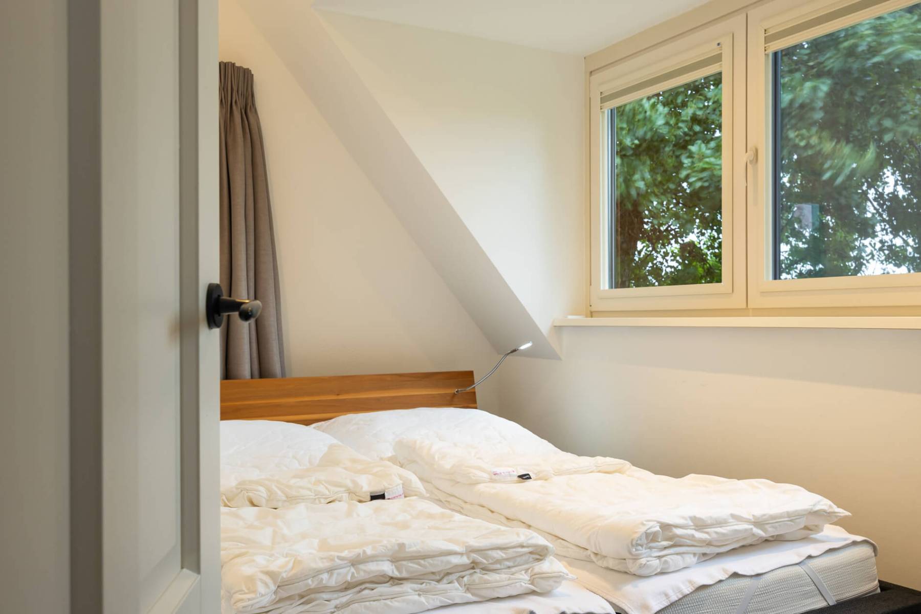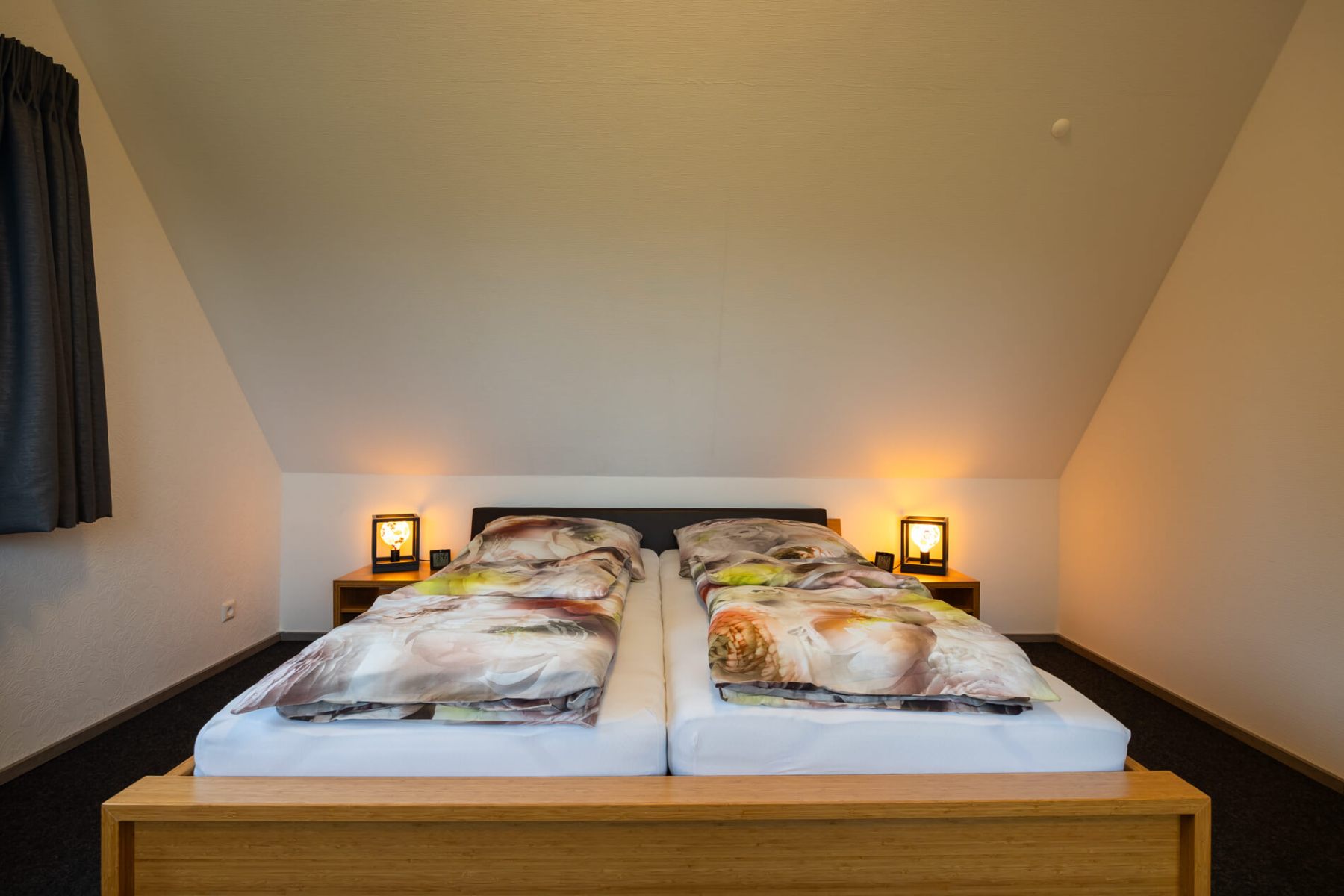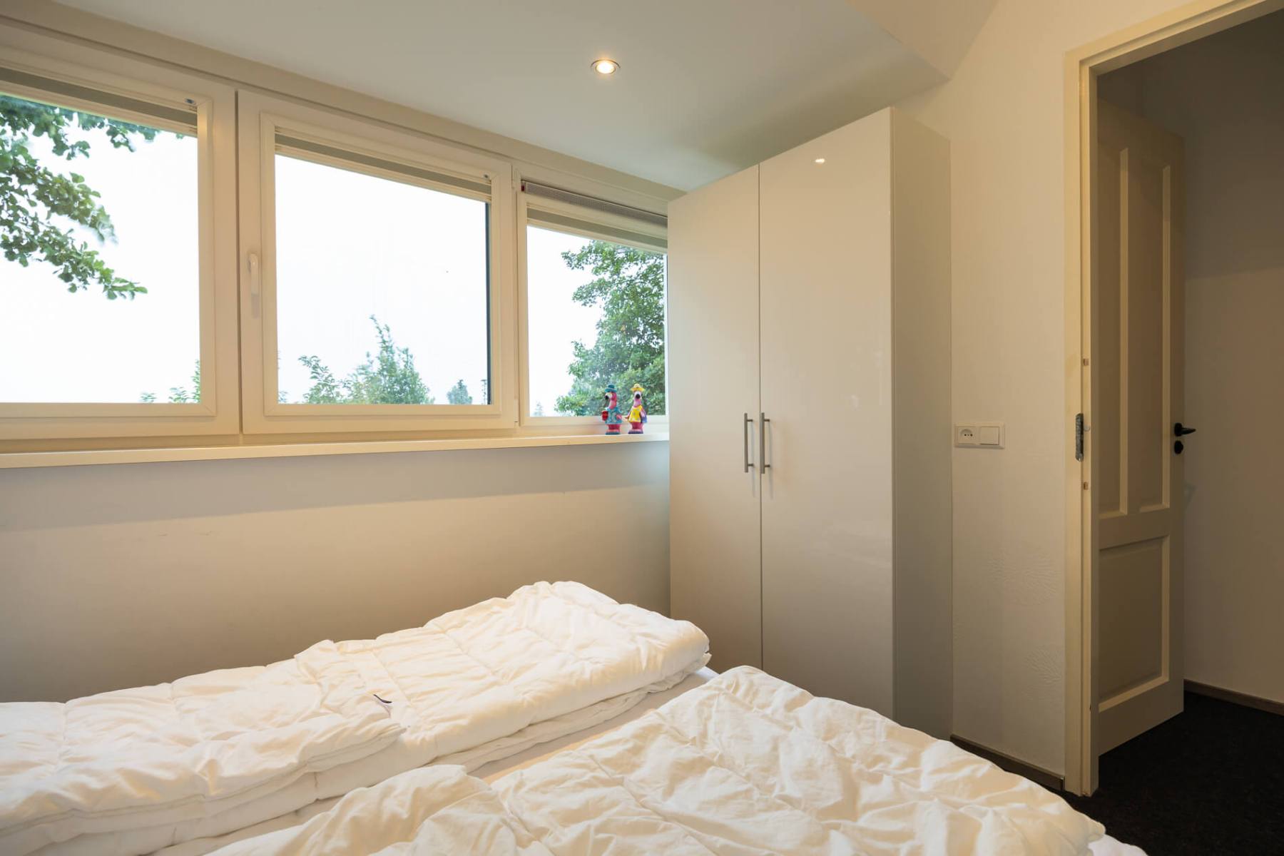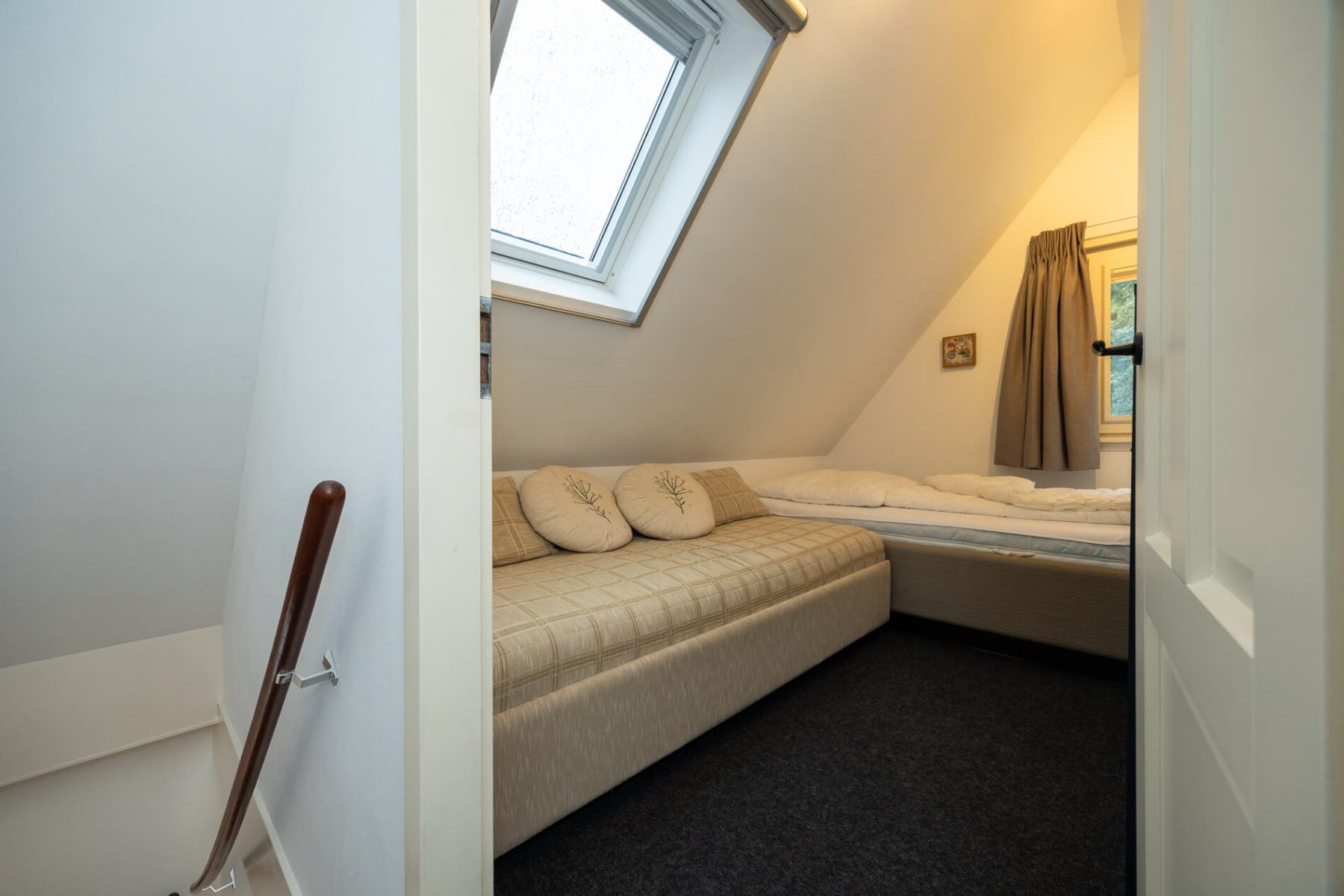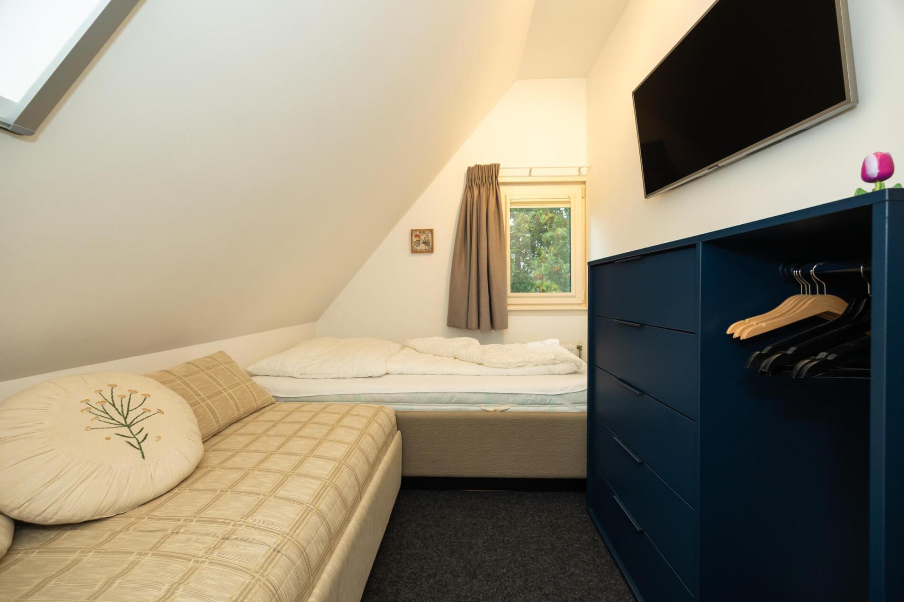Die beiden kleineren Zimmer auf der linken Seite des Flurs sind zurzeit mit jeweils 2 Einzelbetten (90×200 cm) und je einer Kommode ausgestattet, Die Einzelbetten können leicht aneinander geschoben werden und so zu einem “Doppelbett” umfunktioniert werden.