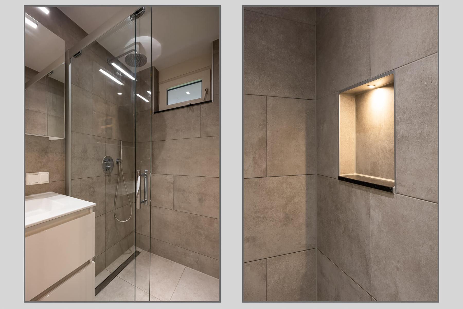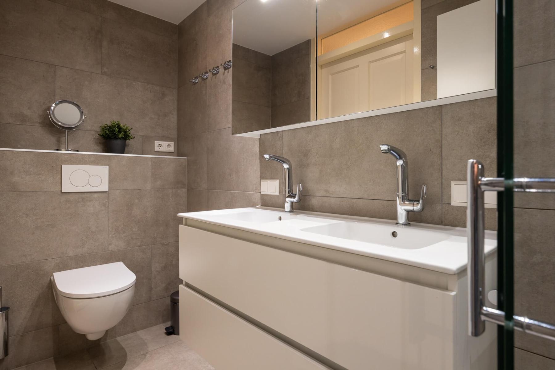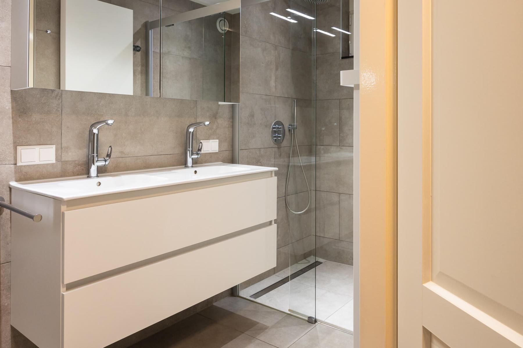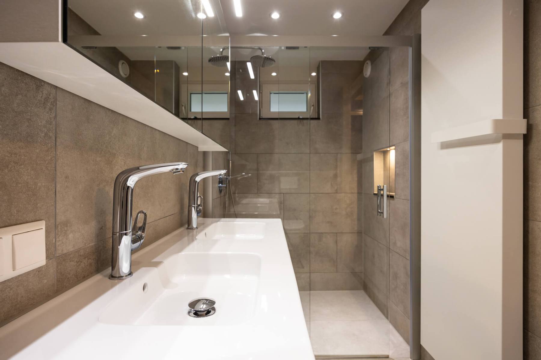 Das im EG befindliche Bad bietet eine ebenerdig begehbare Dusche, eine Toilette, einen großen Spiegelschrank und einen Unterschrank.
