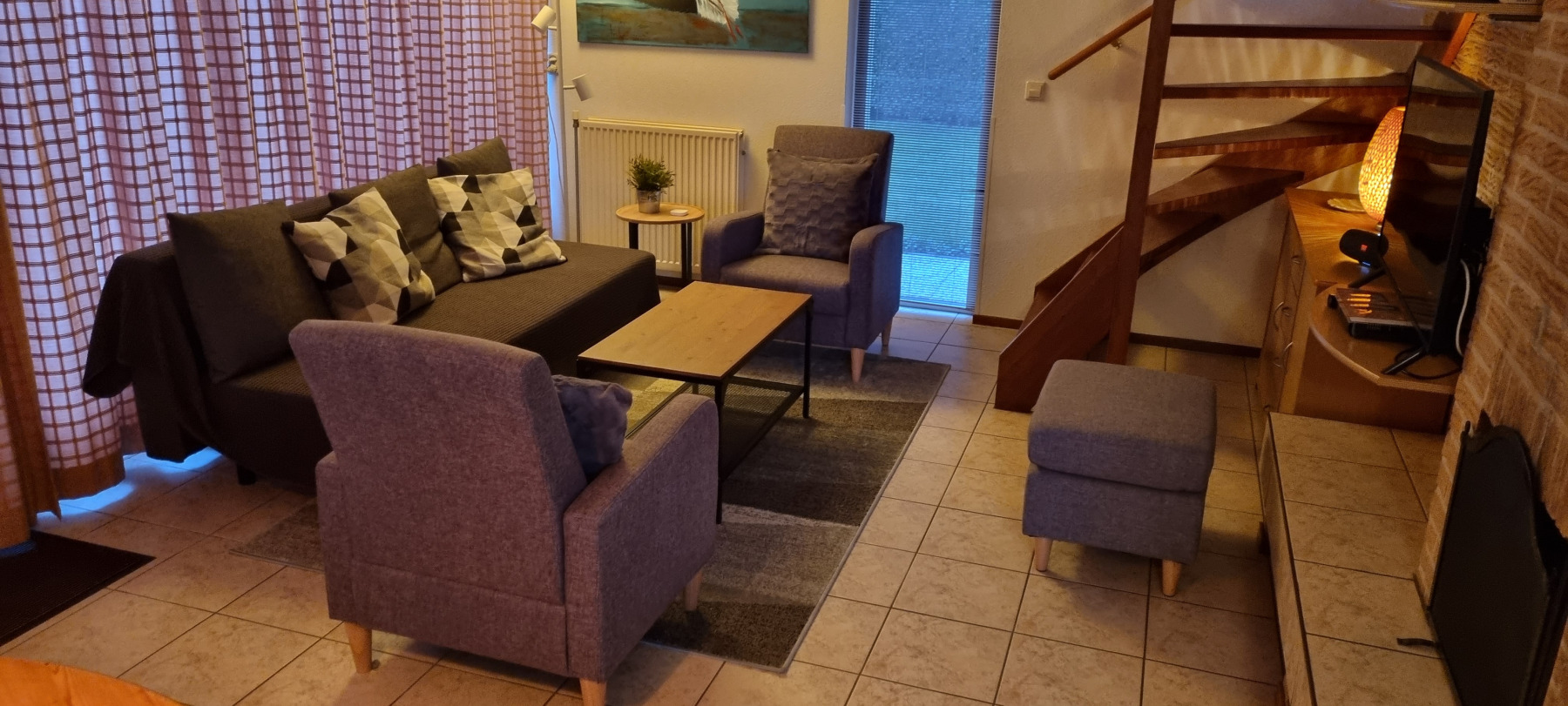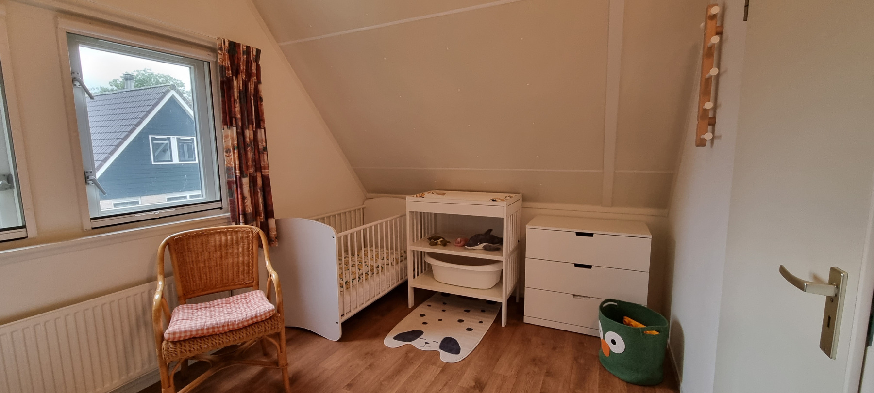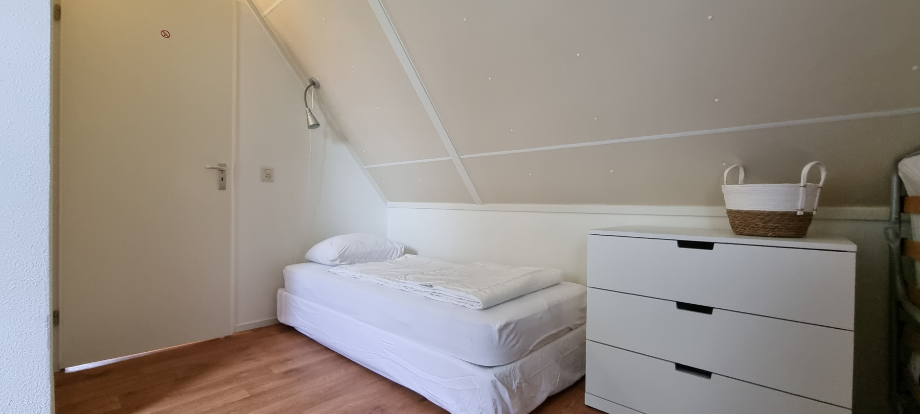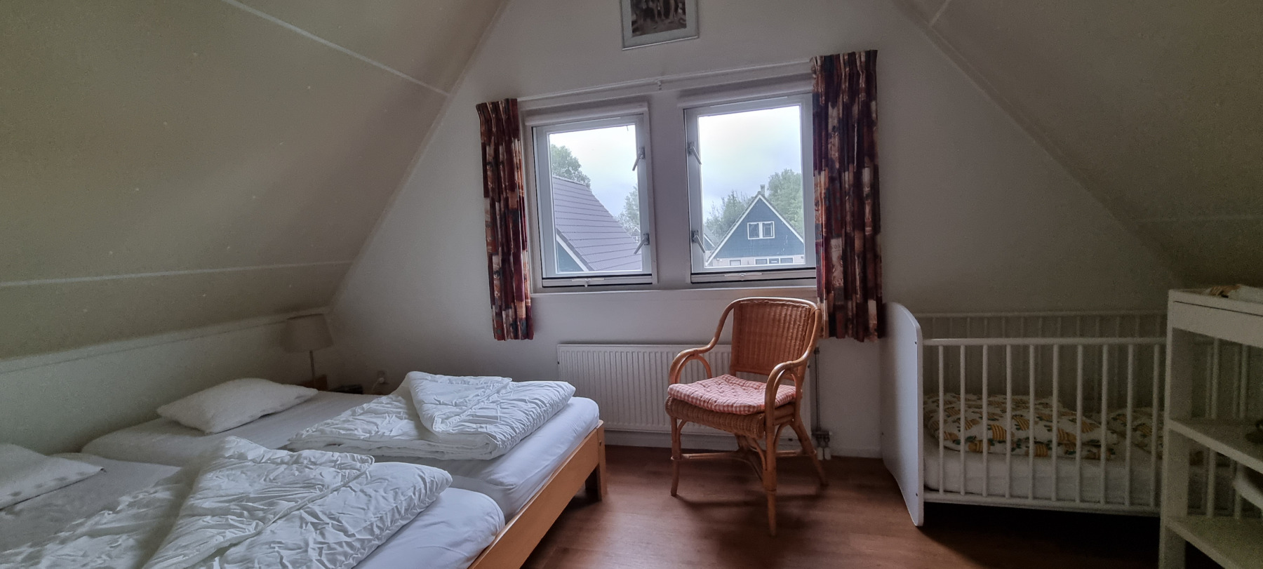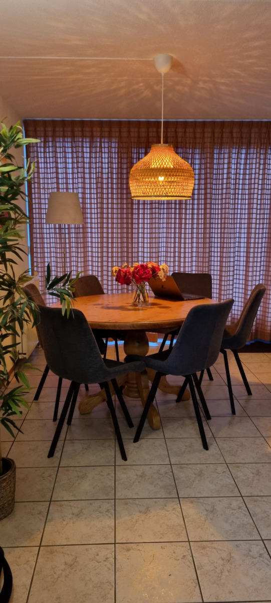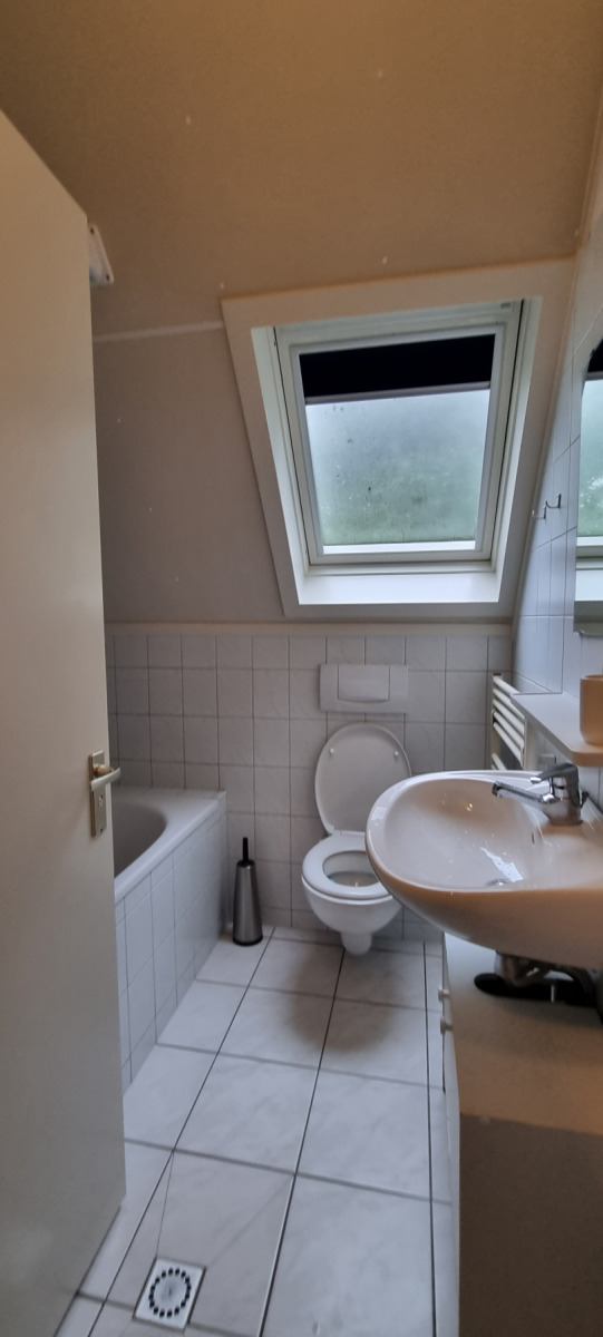 Op de bovenverdieping bevinden zich drie slaapkamers en een gastentoilet. Ook hier zijn alle kamers volledig gerenoveerd en alle wanden gestuukt. Het hoogtepunt hier is de dakkapel, die zich over de gehele lengte van de woning (8 meter) uitstrekt en een fantastisch uitzicht geeft op het aangrenzende veld naar het oosten (rijzende zon). Alle ramen in de dakkapel hebben verduisteringsplissés bekomen. Daarnaast hebben twee slaapkamers en het gastentoilet een op maat gemaakte hor gekregen. De derde slaapkamer heeft nog een schuin dak en daarom een extra Velux raam met hor gekregen. Dus deze kamer is daarmee ook licht en vriendelijk. De hoofdslaapkamer heeft een grote kledingkast met schuifdeuren, peuterapparatuur met een commode en houten bed (Hülsta) en een tweepersoonsbed van massief bamboehout. De tweede slaapkamer heeft een tweepersoonsbed (Hülsta) en een kledingkast. In de derde slaapkamer hebben wij iets nieuws probeerd en twee RUF-bedden met elektrische bediening geplaatst (… wij zijn benieuwd of het lukt …). Dit is inclusief een ladekast met een kapstok en nog een UHD tv van Samsung in het formaat 43 inch. Dit heeft ook HD-kanalen van Ziggo. Ten slotte is ook het gastentoilet volledig vernieuwd. Doordat het zich binnen de dakkapel bevindt, is er ook geen schuin dak en biedt het dus meer comfort. Om dit huis allergievriendelijk te maken, hebben alle kamers een Treftord-tapijt (geitenhaar) en dekbedden en kussens van geschikte materialen gekregen. We garanderen dat alle dekbedden en kussens minstens twee keer per jaar machinaal worden gereinigd.