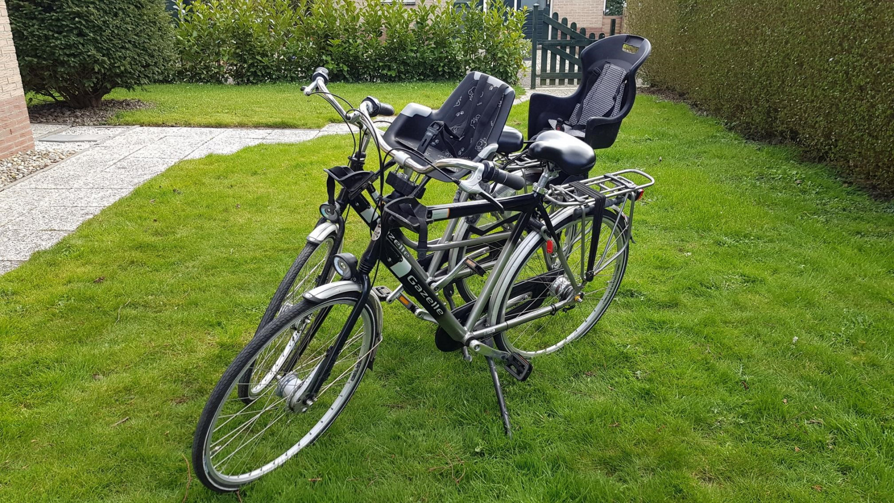 - hoogwaardige Gazelle-fietsen met kinderwagenaanhanger van Thule en 2 kinderzitjes