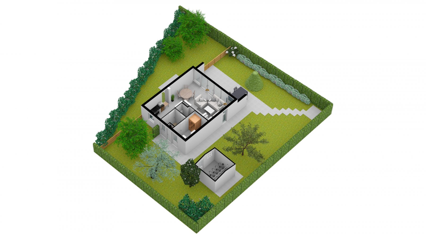 De woning is volledig gerenoveerd en volledig opnieuw ingericht. In de beschrijving willen we beginnen met het stuk land waarop twee bomen zijn gekapt, alle wortels van oude bomen zijn uitgefreesd, twee nieuwe heggen zijn geplaatst en het hele stuk land is rechtgetrokken en met graszode aangelegd. Vervolgens is er een tuinhuisje neergezet en het terras opnieuw betegeld.