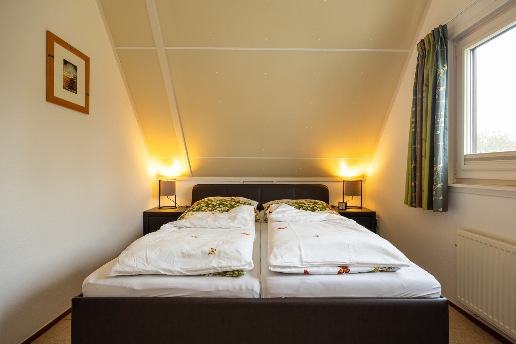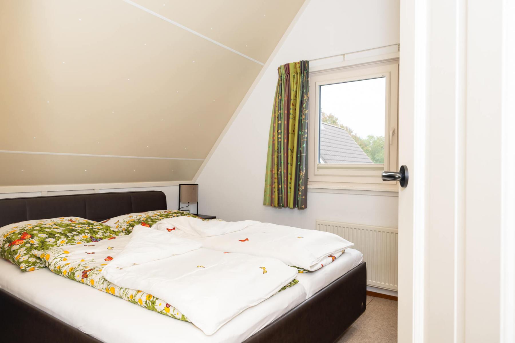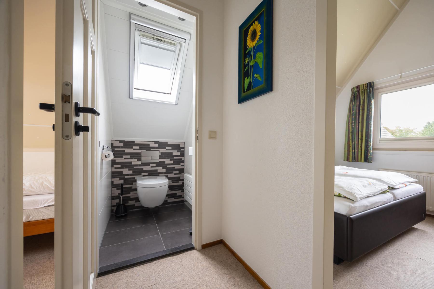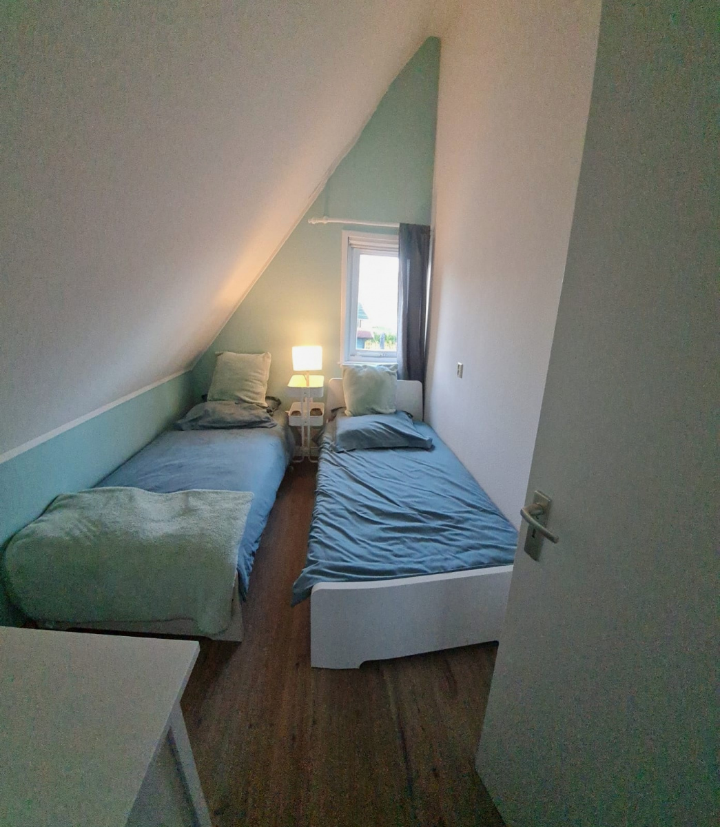 Op de bovenverdieping bevinden zich drie slaapkamers en een gastentoilet. Ook hier zijn alle kamers volledig gerenoveerd en alle wanden gestuukt. Het hoogtepunt hier is de dakkapel, die zich over de gehele lengte van de woning (8 meter) uitstrekt en een fantastisch uitzicht geeft op het aangrenzende veld naar het oosten (rijzende zon). Alle ramen in de dakkapel hebben verduisteringsplissés bekomen. Daarnaast hebben twee slaapkamers en het gastentoilet een op maat gemaakte hor gekregen. De derde slaapkamer heeft nog een schuin dak en daarom een extra Velux raam met hor gekregen. Dus deze kamer is daarmee ook licht en vriendelijk. De hoofdslaapkamer heeft een grote kledingkast met schuifdeuren, peuterapparatuur met een commode en houten bed (Hülsta) en een tweepersoonsbed van massief bamboehout. De tweede slaapkamer heeft een tweepersoonsbed (Hülsta) en een kledingkast. In de derde slaapkamer hebben wij iets nieuws probeerd en twee RUF-bedden met elektrische bediening geplaatst (… wij zijn benieuwd of het lukt …). Dit is inclusief een ladekast met een kapstok en nog een UHD tv van Samsung in het formaat 43 inch. Dit heeft ook HD-kanalen van Ziggo. Ten slotte is ook het gastentoilet volledig vernieuwd. Doordat het zich binnen de dakkapel bevindt, is er ook geen schuin dak en biedt het dus meer comfort. Om dit huis allergievriendelijk te maken, hebben alle kamers een Treftord-tapijt (geitenhaar) en dekbedden en kussens van geschikte materialen gekregen. We garanderen dat alle dekbedden en kussens minstens twee keer per jaar machinaal worden gereinigd.