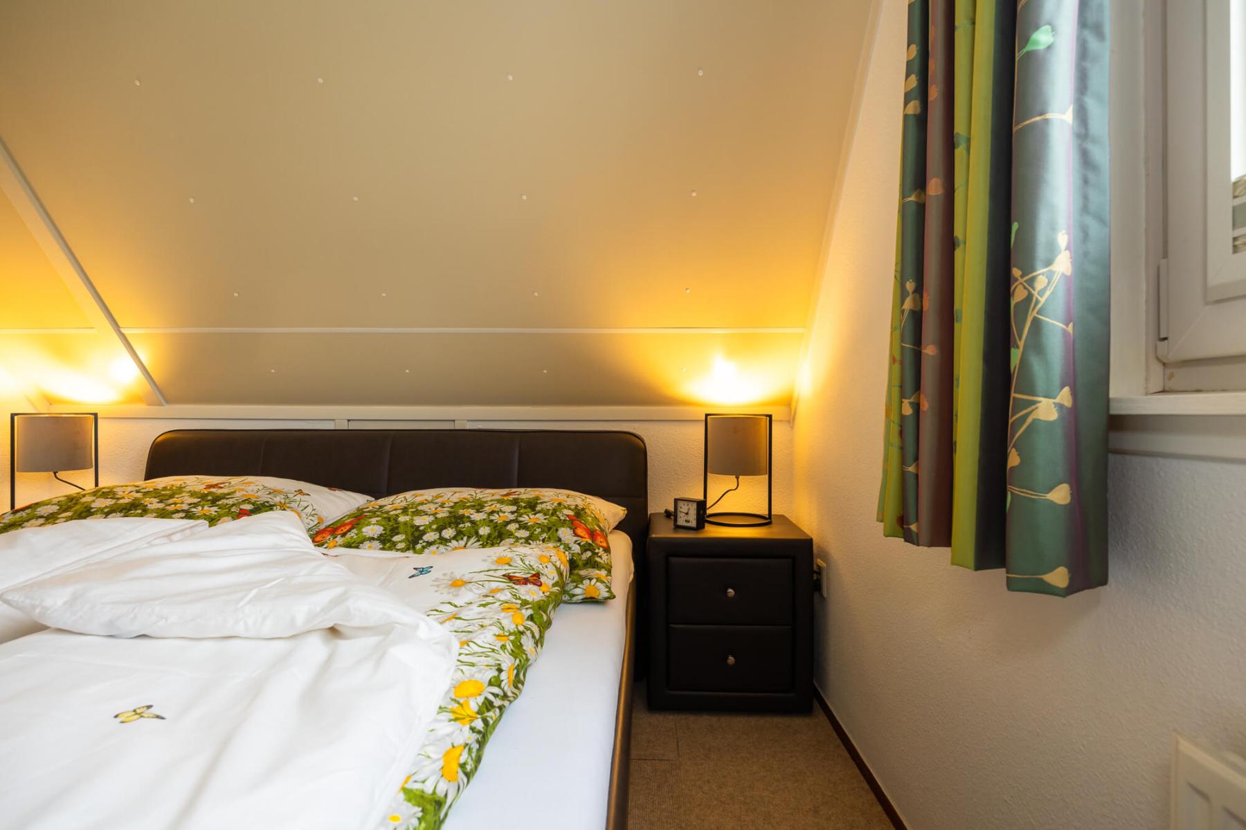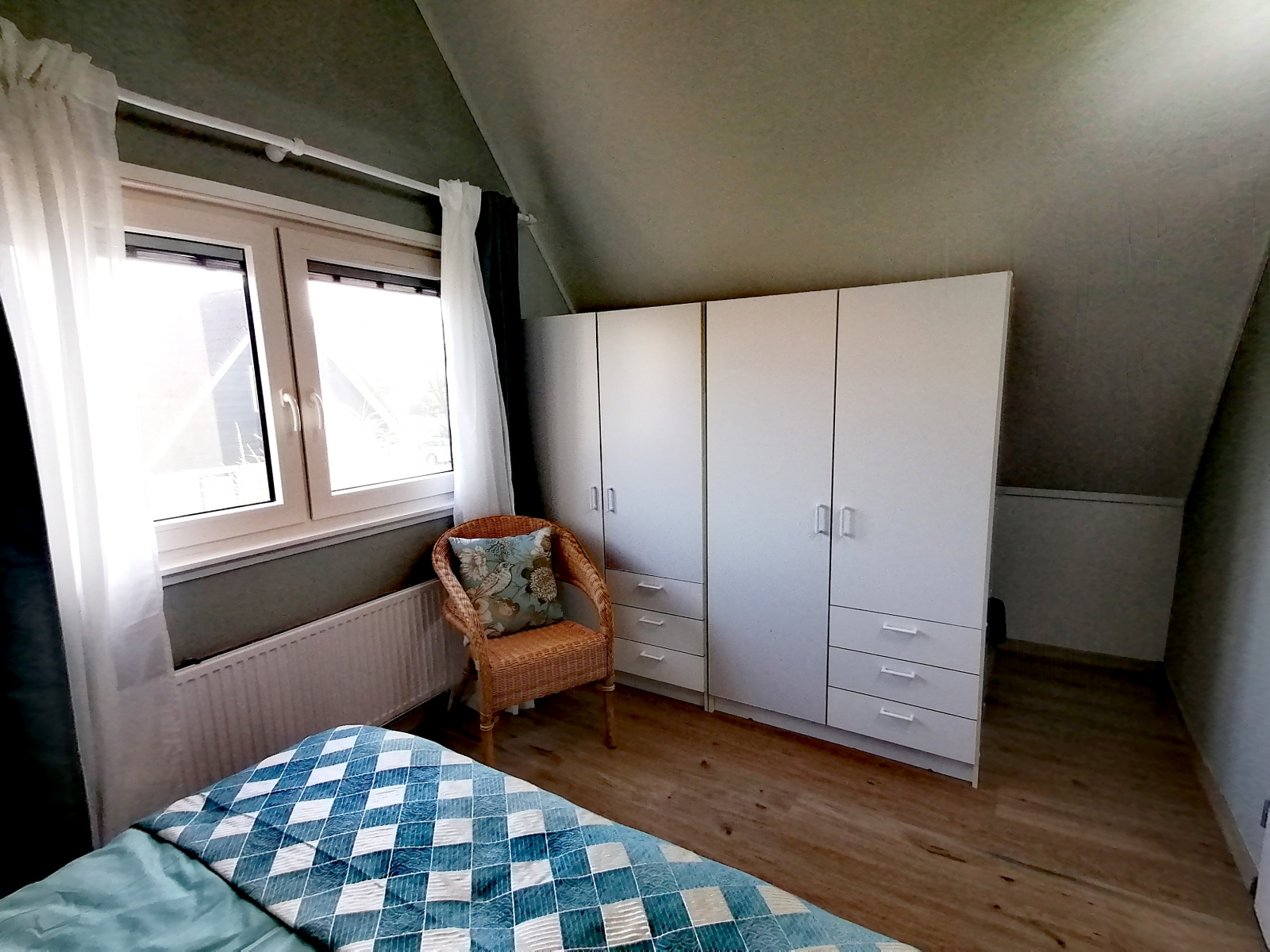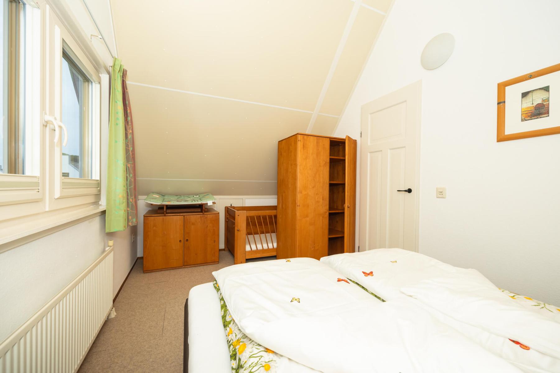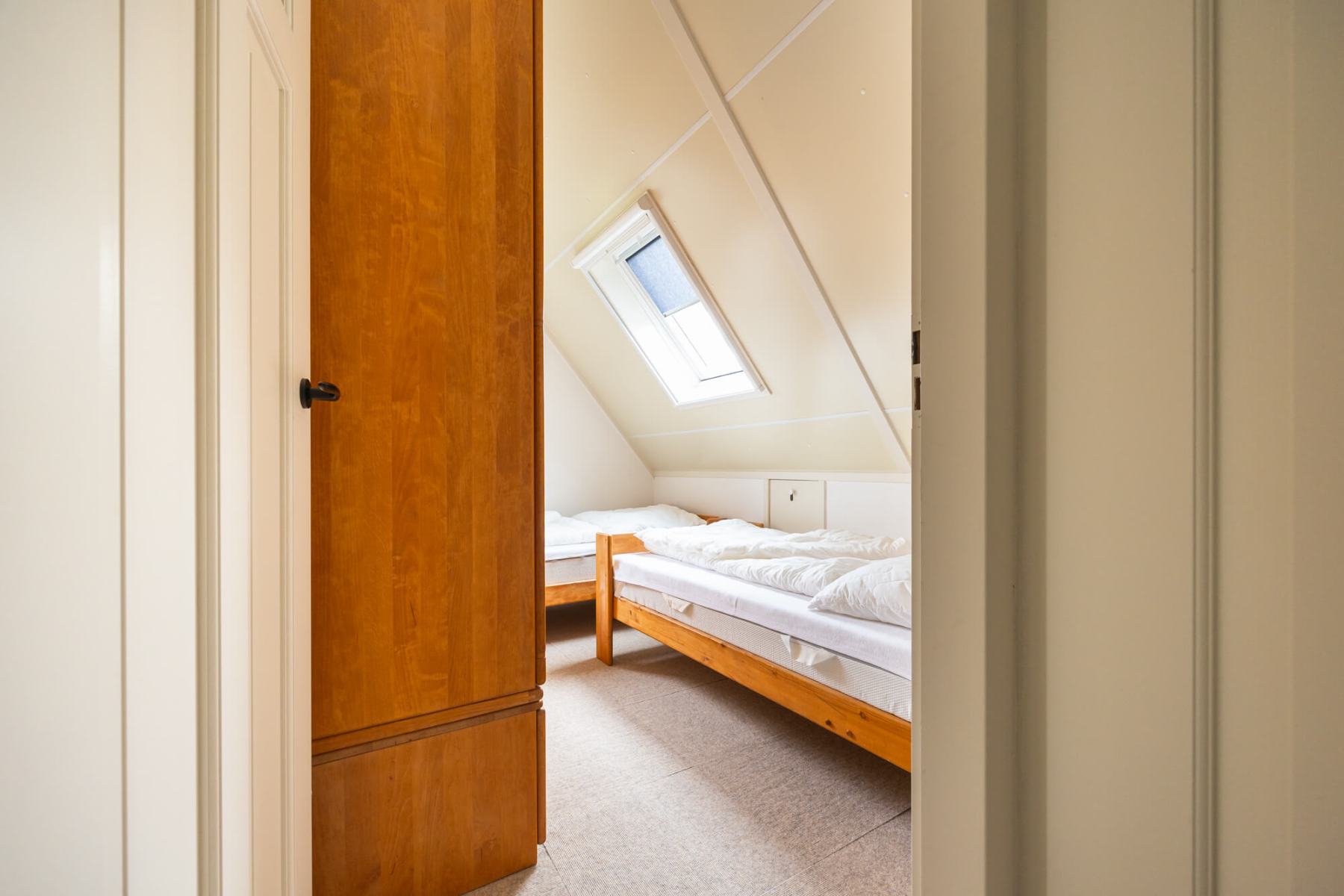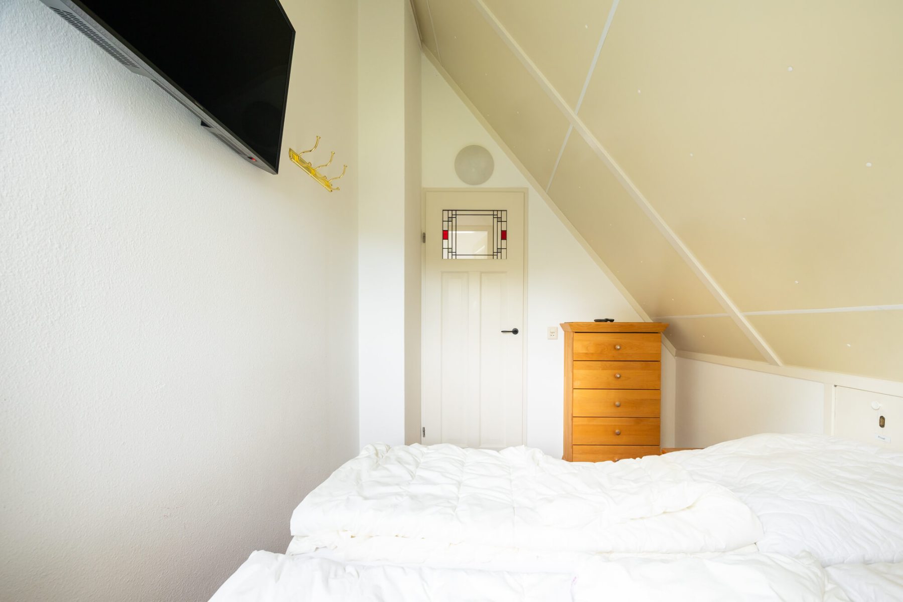 Op de bovenverdieping bevinden zich drie slaapkamers en een gastentoilet. Ook hier zijn alle kamers volledig gerenoveerd en alle wanden gestuukt. Het hoogtepunt hier is de dakkapel, die zich over de gehele lengte van de woning (8 meter) uitstrekt en een fantastisch uitzicht geeft op het aangrenzende veld naar het oosten (rijzende zon). Alle ramen in de dakkapel hebben verduisteringsplissés bekomen. Daarnaast hebben twee slaapkamers en het gastentoilet een op maat gemaakte hor gekregen. De derde slaapkamer heeft nog een schuin dak en daarom een extra Velux raam met hor gekregen. Dus deze kamer is daarmee ook licht en vriendelijk. De hoofdslaapkamer heeft een grote kledingkast met schuifdeuren, peuterapparatuur met een commode en houten bed (Hülsta) en een tweepersoonsbed van massief bamboehout. De tweede slaapkamer heeft een tweepersoonsbed (Hülsta) en een kledingkast. In de derde slaapkamer hebben wij iets nieuws probeerd en twee RUF-bedden met elektrische bediening geplaatst (… wij zijn benieuwd of het lukt …). Dit is inclusief een ladekast met een kapstok en nog een UHD tv van Samsung in het formaat 43 inch. Dit heeft ook HD-kanalen van Ziggo. Ten slotte is ook het gastentoilet volledig vernieuwd. Doordat het zich binnen de dakkapel bevindt, is er ook geen schuin dak en biedt het dus meer comfort. Om dit huis allergievriendelijk te maken, hebben alle kamers een Treftord-tapijt (geitenhaar) en dekbedden en kussens van geschikte materialen gekregen. We garanderen dat alle dekbedden en kussens minstens twee keer per jaar machinaal worden gereinigd.