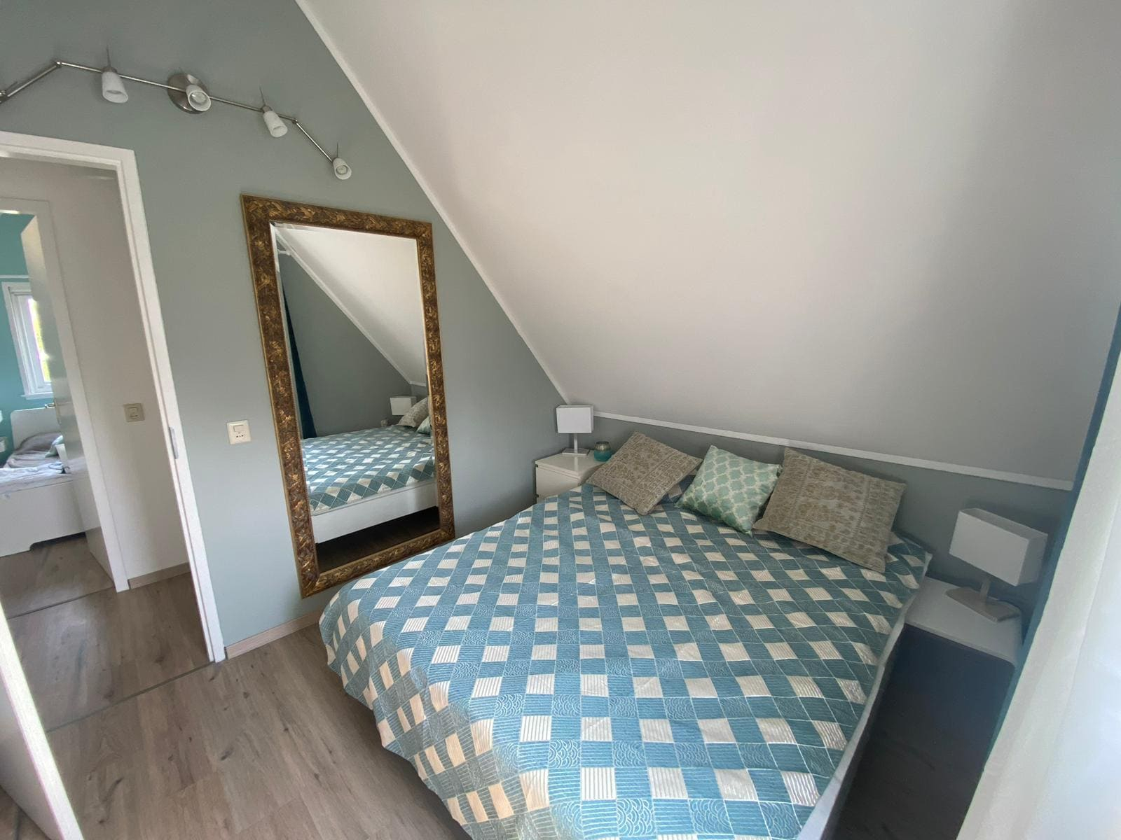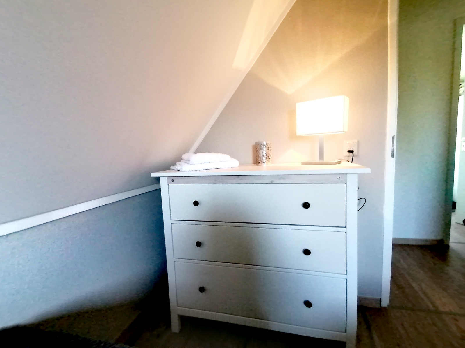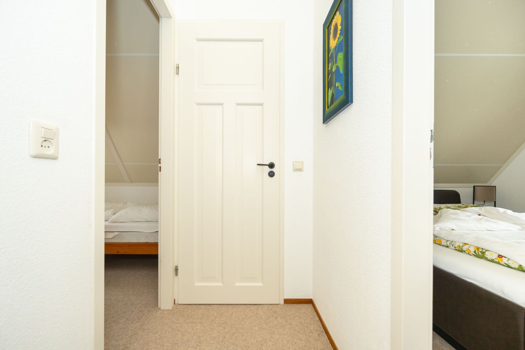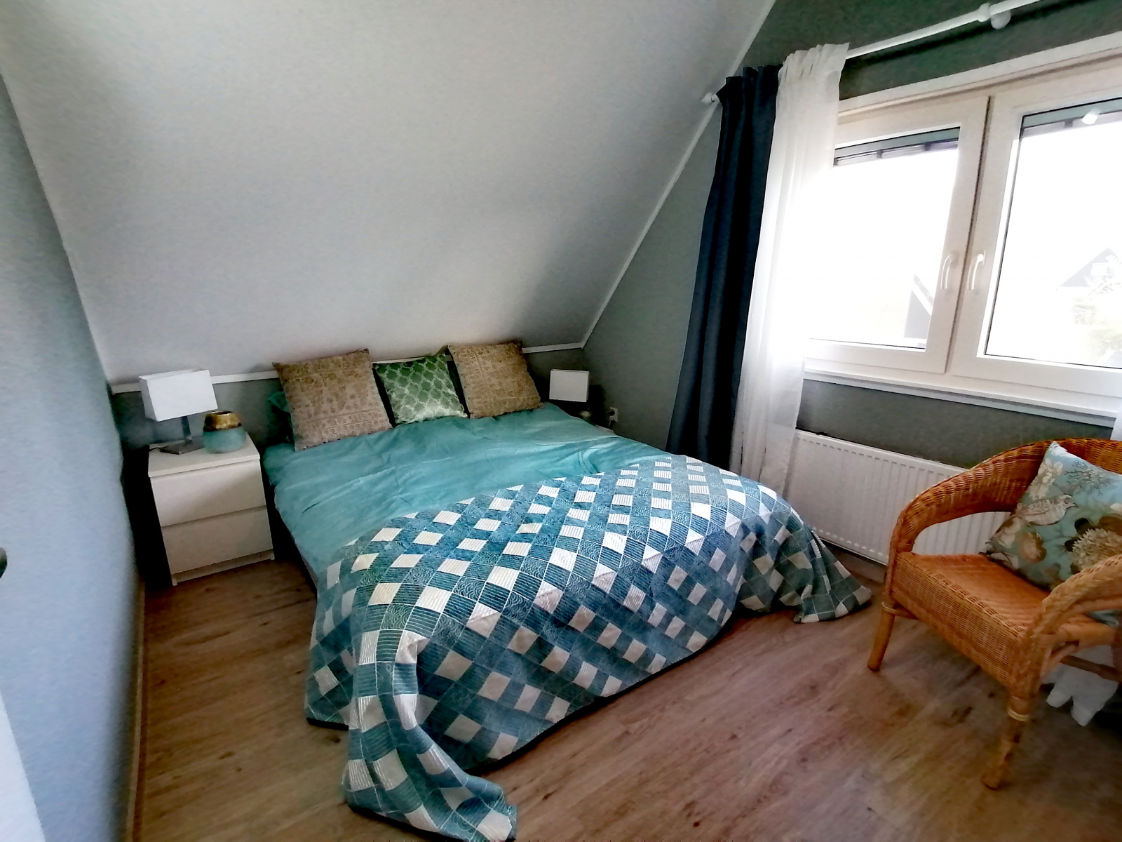 Op de bovenverdieping bevinden zich drie slaapkamers en een gastentoilet. Ook hier zijn alle kamers volledig gerenoveerd en alle wanden gestuukt. Het hoogtepunt hier is de dakkapel, die zich over de gehele lengte van de woning (8 meter) uitstrekt en een fantastisch uitzicht geeft op het aangrenzende veld naar het oosten (rijzende zon). Alle ramen in de dakkapel hebben verduisteringsplissés bekomen. Daarnaast hebben twee slaapkamers en het gastentoilet een op maat gemaakte hor gekregen. De derde slaapkamer heeft nog een schuin dak en daarom een extra Velux raam met hor gekregen. Dus deze kamer is daarmee ook licht en vriendelijk. De hoofdslaapkamer heeft een grote kledingkast met schuifdeuren, peuterapparatuur met een commode en houten bed (Hülsta) en een tweepersoonsbed van massief bamboehout. De tweede slaapkamer heeft een tweepersoonsbed (Hülsta) en een kledingkast. In de derde slaapkamer hebben wij iets nieuws probeerd en twee RUF-bedden met elektrische bediening geplaatst (… wij zijn benieuwd of het lukt …). Dit is inclusief een ladekast met een kapstok en nog een UHD tv van Samsung in het formaat 43 inch. Dit heeft ook HD-kanalen van Ziggo. Ten slotte is ook het gastentoilet volledig vernieuwd. Doordat het zich binnen de dakkapel bevindt, is er ook geen schuin dak en biedt het dus meer comfort. Om dit huis allergievriendelijk te maken, hebben alle kamers een Treftord-tapijt (geitenhaar) en dekbedden en kussens van geschikte materialen gekregen. We garanderen dat alle dekbedden en kussens minstens twee keer per jaar machinaal worden gereinigd.